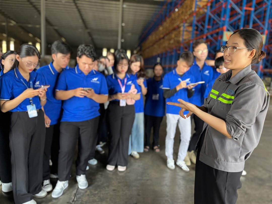 Bên cạnh hoạt động tham quan, sinh viên còn tham gia trao đổi, thảo luận trực tiếp với đại diện doanh nghiệp về kỹ năng nghề nghiệp, tiêu chuẩn tuyển dụng, cơ hội thực tập và định hướng phát triển nghề nghiệp trong lĩnh vực logistics. Những chia sẻ từ thực tiễn giúp sinh viên hiểu rõ hơn vai trò của kho ngoại quan trong chuỗi cung ứng và yêu cầu của môi trường làm việc chuyên nghiệp.