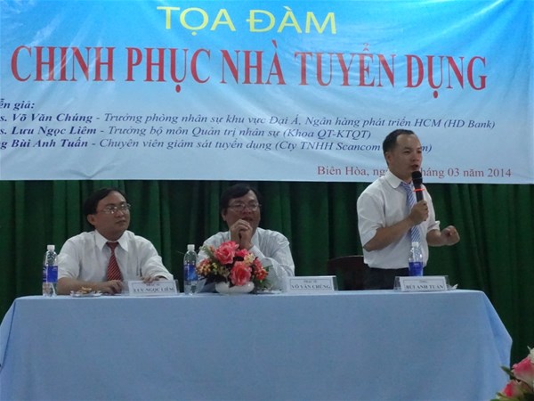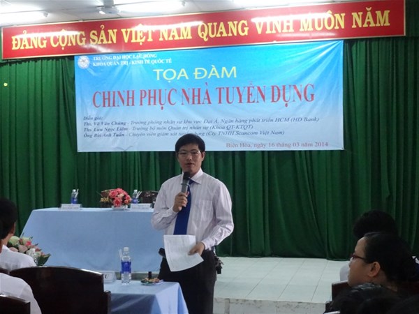 The talk was attended by speakers Vo Van Chung, M.A - Head of Human Resources Division, HD Bank ; Luu Ngoc Liem, M.A - Head of Human Resources Management Subject; Mr. Bui Anh Tuan - Recruitment Supervisor, Scancom Vietnam Co. Ltd., and Dr. Nguyen Van Tan - Dean of Faculty of International Economics Administration, and a large number of lecturers and students at all levels.