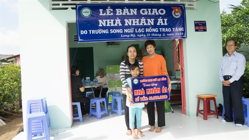 Recently, Lac Hong Charitable Fund in cooperation with Lac Hong Bilingual School and Long My commune's People Committee held a ceremony to hand over a charity house to the family of Mrs. Le Thi Tham and Hoang Kim residing in Long Hoa 2 hamlet, Long My commune, Mang Thit district, Vinh Long province. The house with a cost of VND 60 million was contributed by Lac Hong Charitable Fund, teachers, students, benefactors....