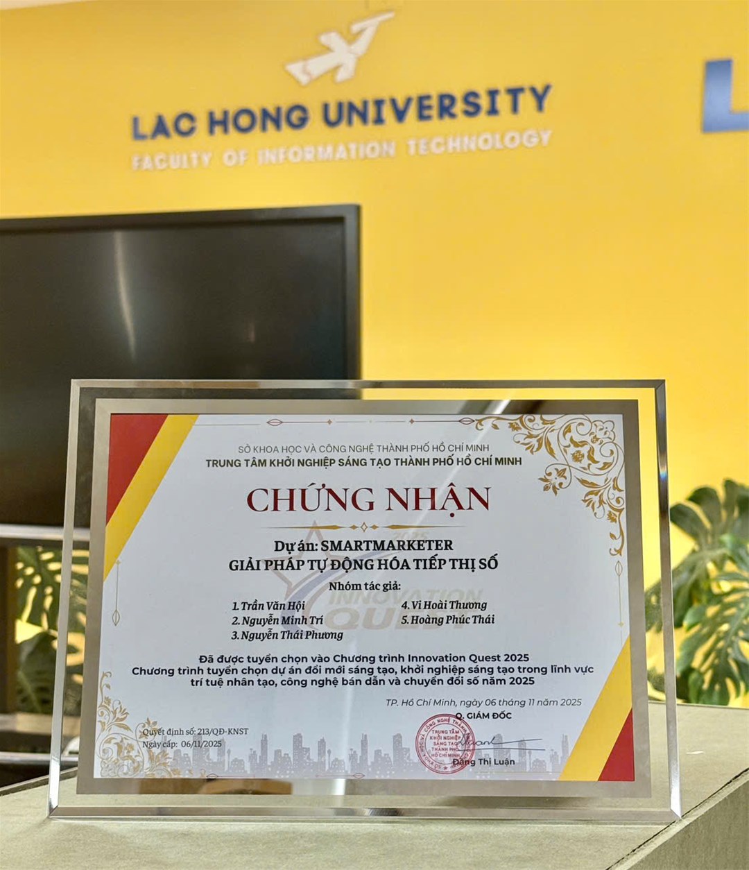 Students from the Faculty of Information Technology at Lac Hong University (LHU) demonstrated outstanding capability when the SmartMarketer team participated in the Competition Round of Innovation Quest 2025, held on October 23, 2025, at SIHUB. On a professional technological stage, the students presented their AI-driven Digital Marketing Automation solution with confidence, clarity, and high applicability. The presentation of a functioning prototype, combined with a robust defense against in-depth questions, highlighted the students' thorough preparation and mastery of their subject matter.