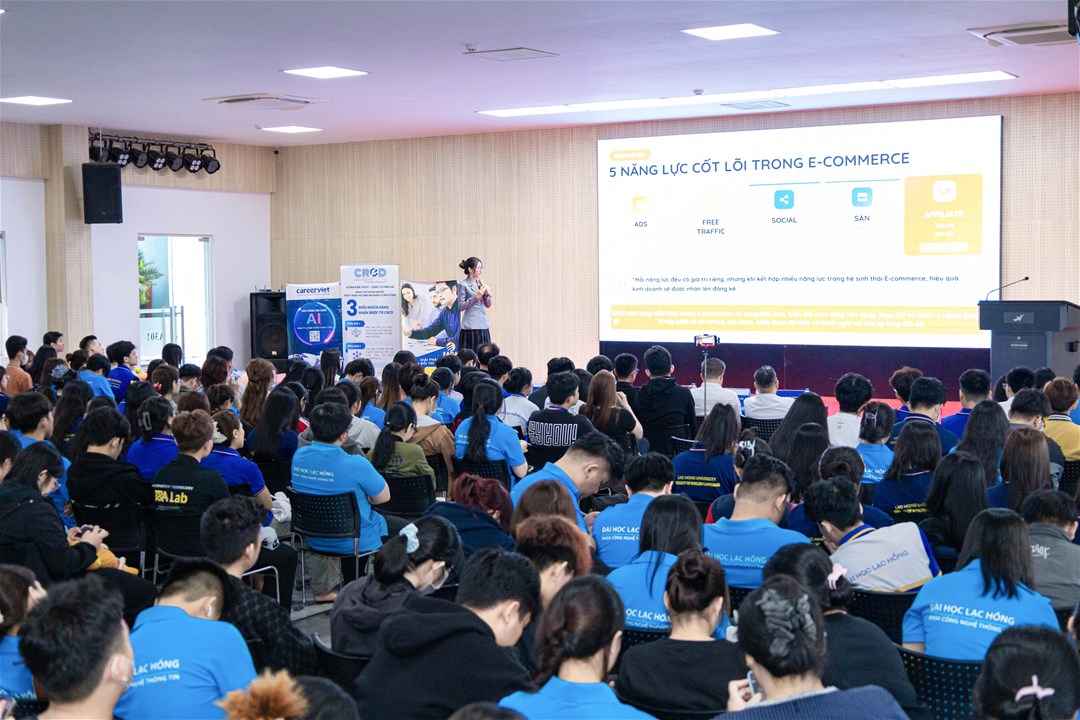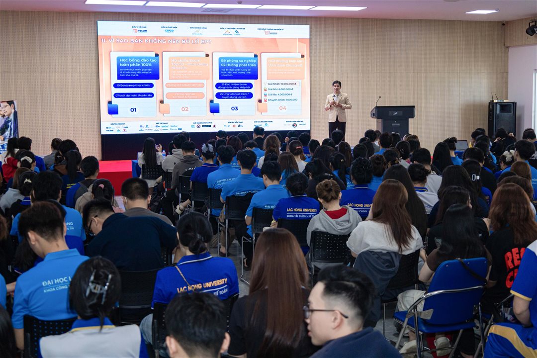 On March 7, 2026, the Faculty of Information Technology at Lac Hong University (LHU), in collaboration with the Vietnam E-commerce Association (VECOM), successfully organized the Ecom Tour, introducing the Ecommerce Passport training scholarship. The event aimed to strengthen the connection between the university, the association, and enterprises, while providing students with practical exposure to the e-commerce industry and the digital business ecosystem.